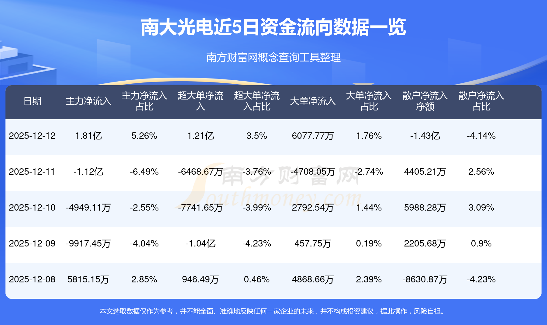 12月12日消息,南大光電資金凈流入1.81億元,超大單資金凈流入1.21億元,換手率9.49%,成交金額26.7億元。