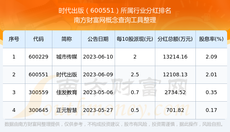 按照南方財(cái)富網(wǎng)趨勢(shì)選股系統(tǒng)統(tǒng)計(jì),時(shí)代出版所屬行業(yè)為文化傳媒行業(yè),文化傳媒行業(yè)分紅排名情況如下表: