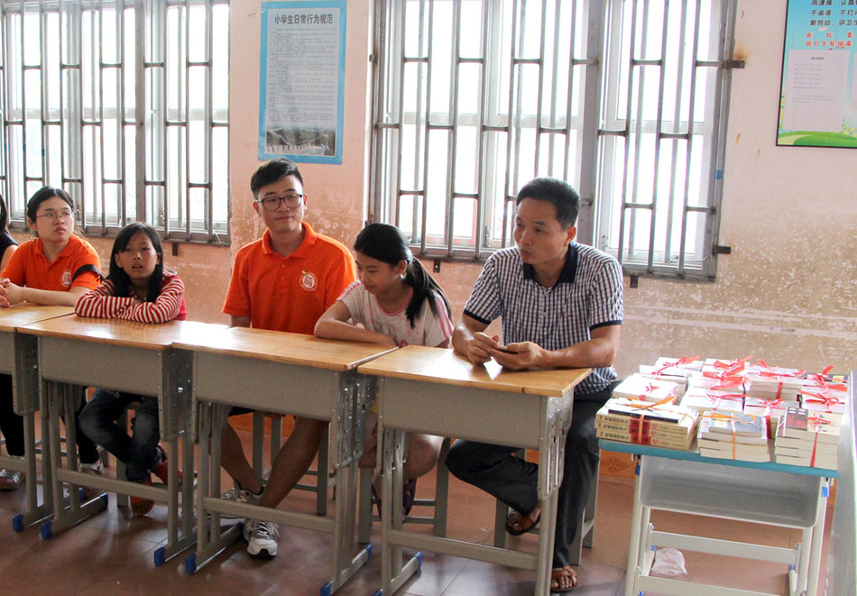 方銀城校長(右一)給志愿者們講述他與峰頭小學(xué)的故事