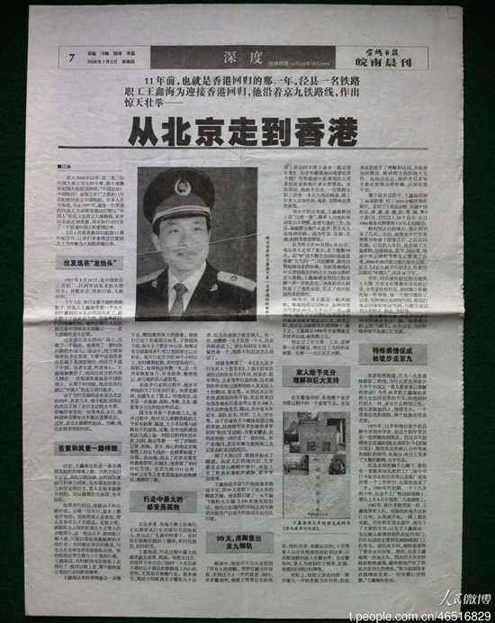 1997年對中國人來說,是難忘的一年。香港終于結(jié)束了英國殖民地身份,回歸祖國懷抱。為迎接這一歷史性時刻,1997年3月10日下午3點,安徽蕪湖鐵路職工、涇縣人王鑫海背起一個大大的行囊獨自從北京西站出發(fā),踏上徒步京九線、迎接香港回歸的漫漫征程。