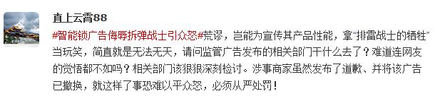 引發(fā)爭議的廣告是“凱迪仕智能鎖”雙11期間推出的。網(wǎng)友認(rèn)為該廣告涉嫌侮辱排雷戰(zhàn)士,紛紛聲討:利欲熏心,無底線,無下限,要是不肅清,對(duì)不起那么多流血犧牲的英雄!