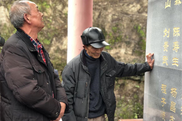 二處老職工周勝才(左)、蒲祖厚(右)在枝柳鐵路烈士紀念亭悼念老戰(zhàn)友。 人民網(wǎng)記者 張葳攝