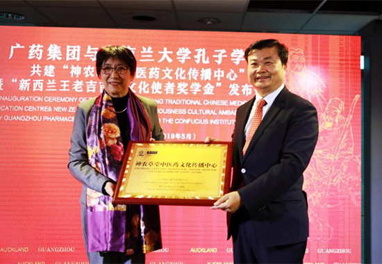 廣藥集團(tuán)向奧克蘭大學(xué)孔子學(xué)院授予“神農(nóng)草堂中醫(yī)藥文化傳播中心”牌匾,寓意雙方將共同推廣中醫(yī)藥文化