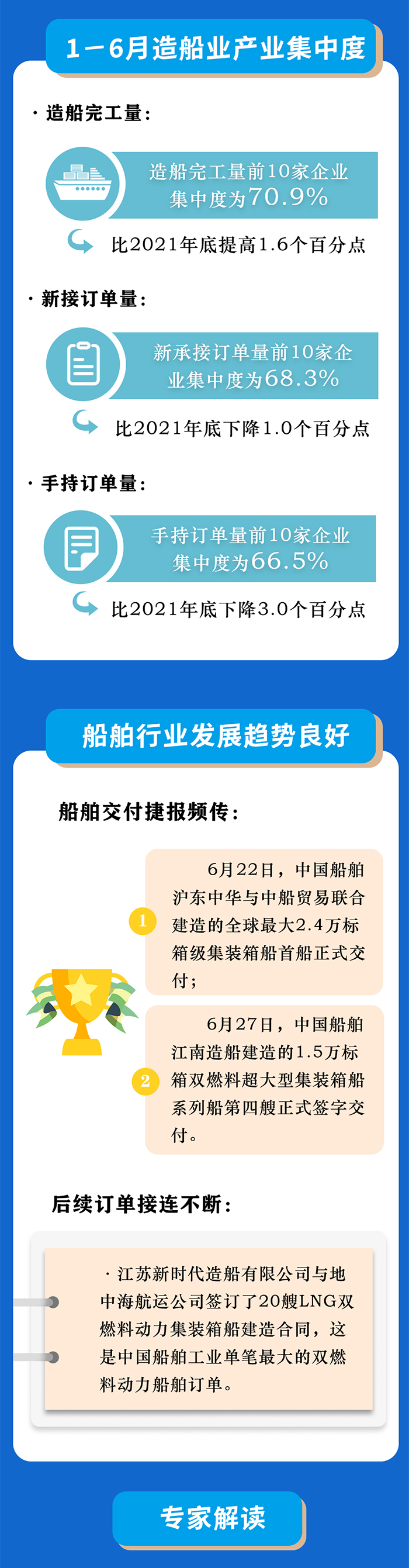 “上半年中國(guó)船舶工業(yè)克服不利影響,主要指標(biāo)繼續(xù)保持世界第一,這是一個(gè)了不起的成績(jī)!敝袊(guó)船舶工業(yè)行業(yè)協(xié)會(huì)秘書長(zhǎng)李彥慶在接受人民網(wǎng)“強(qiáng)觀察”欄目記者采訪時(shí)表示,上半年我國(guó)船舶工業(yè)呈現(xiàn)出五方面特點(diǎn):一是接單的船型結(jié)構(gòu)不斷優(yōu)化。從以散貨船和油船等傳統(tǒng)船型為主,到現(xiàn)在散貨船、油船、集裝箱船、氣體船、客船以及特種船舶均衡發(fā)展。二是重點(diǎn)船型加速突破,新型裝備不斷涌現(xiàn)。今年上半年,大型LNG運(yùn)輸船成交30艘,創(chuàng)造歷史新記錄;汽車運(yùn)輸船市場(chǎng)份額穩(wěn)居世界第一;海上風(fēng)電安裝船、深遠(yuǎn)海養(yǎng)殖裝備等新型海洋裝備實(shí)現(xiàn)批量接單。三是手持訂單不斷增長(zhǎng),為加快轉(zhuǎn)型升級(jí)奠定堅(jiān)實(shí)基礎(chǔ)。當(dāng)前,國(guó)內(nèi)大部分企業(yè)訂單已能滿足2~3年生產(chǎn)量,基本解決了持續(xù)生產(chǎn)經(jīng)營(yíng)的問題。四是產(chǎn)業(yè)結(jié)構(gòu)日趨合理,“專精特新”發(fā)展理念逐步深入。五是跨行業(yè)融合發(fā)展的“產(chǎn)業(yè)生態(tài)體系”逐步建立。