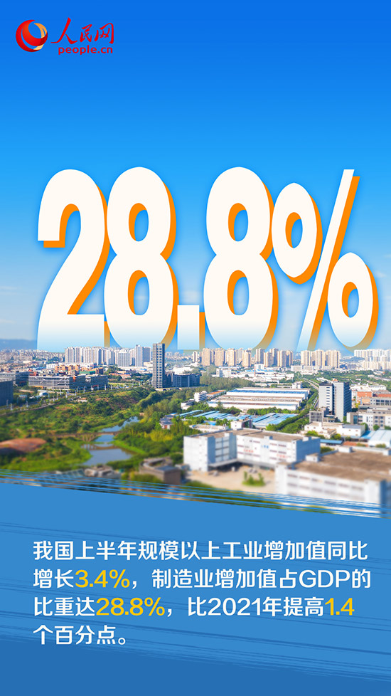 上半年,在各地區(qū)各部門共同努力下,盡管面臨疫情沖擊,產(chǎn)業(yè)鏈供應鏈日益穩(wěn)定暢通,工業(yè)經(jīng)濟迅速扭轉了下滑態(tài)勢,實現(xiàn)了恢復增長。國新辦7月19日舉行發(fā)布會介紹,今年上半年,我國規(guī)模以上工業(yè)增加值同比增長3.4%,規(guī)模以上制造業(yè)增加值同比增長2.8%,制造業(yè)增加值占GDP的比重達28.8%,比2021年提高1.4個百分點。