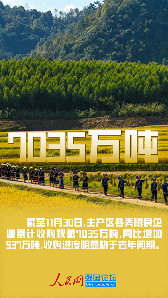 隨著各地大規(guī)模秋收結(jié)束,秋糧開始集中上市交易。據(jù)國家糧食和物資儲備局最新發(fā)布,截至11月30日,主產(chǎn)區(qū)各類糧食企業(yè)累計(jì)收購秋糧7035萬噸,同比增加537萬噸,收購進(jìn)度明顯快于去年同期!跋啾扔2021年、2020年、2019年的6498萬噸、6803萬噸、5614萬噸,與歷年同期相比,今年達(dá)到了近年來糧食企業(yè)秋糧收購數(shù)量的最高值!崩钚潞Uf道。