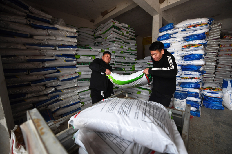 2月8日,河南商丘寧陵縣農(nóng)民將購(gòu)買的化肥運(yùn)到三輪車上。新華社記者 張浩然攝