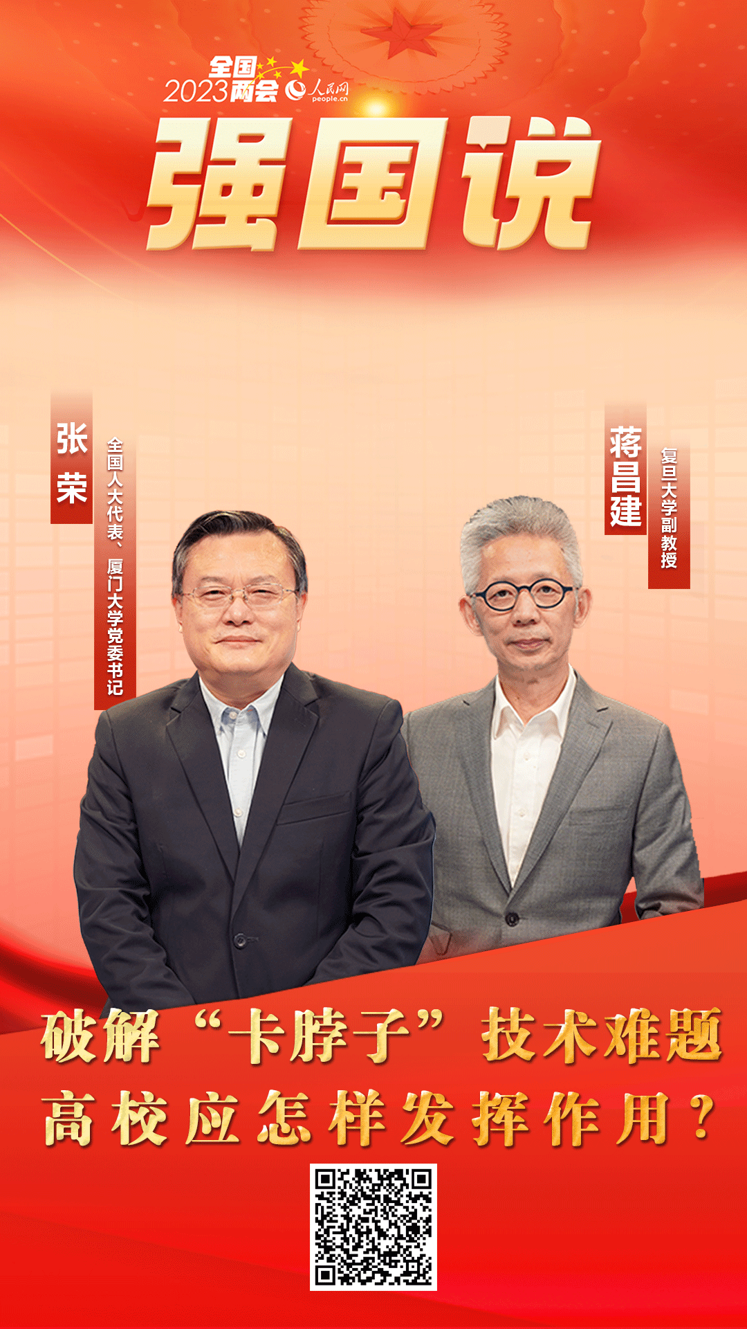 教育、科技、人才是全面建設社會主義現(xiàn)代化國家的基礎性、戰(zhàn)略性支撐。2023年全國兩會期間,人民網(wǎng)《強國說》欄目邀請全國人大代表、廈門大學黨委書記張榮與復旦大學副教授蔣昌建,就相關話題展開探討交流。