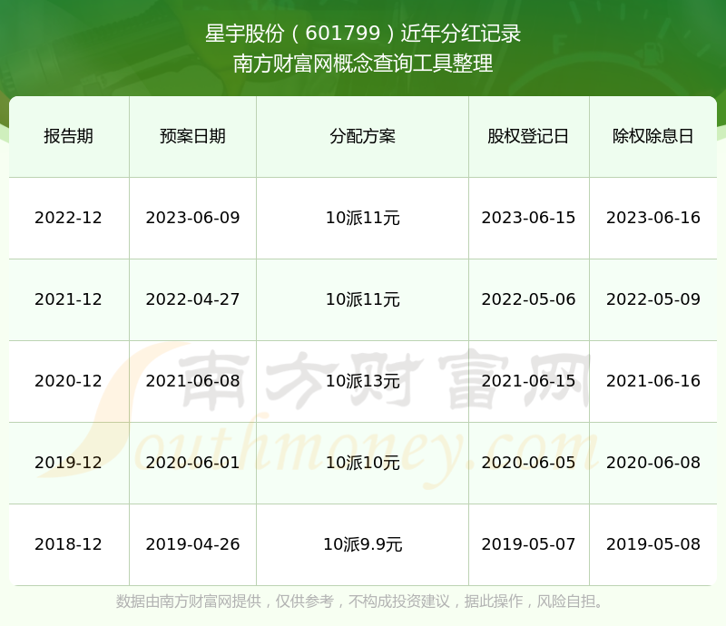 星宇股份最新一次公布的分紅方案為10派11元。本次權(quán)益分派股權(quán)登記日為2023年6月15日,除權(quán)除息日為2023年6月16日,派息日為2023年6月16日。